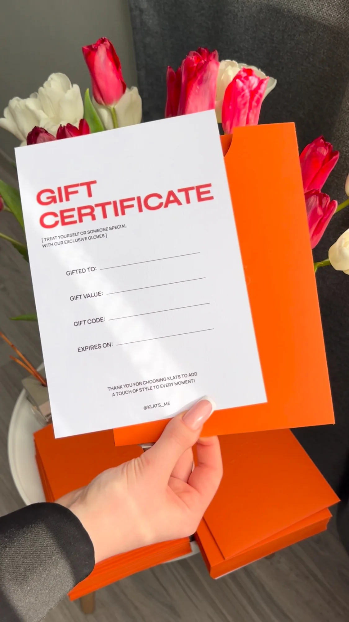 Redeem by sending an Instagram DM to @klats_me with the code from the certificate. The code is applied manually.