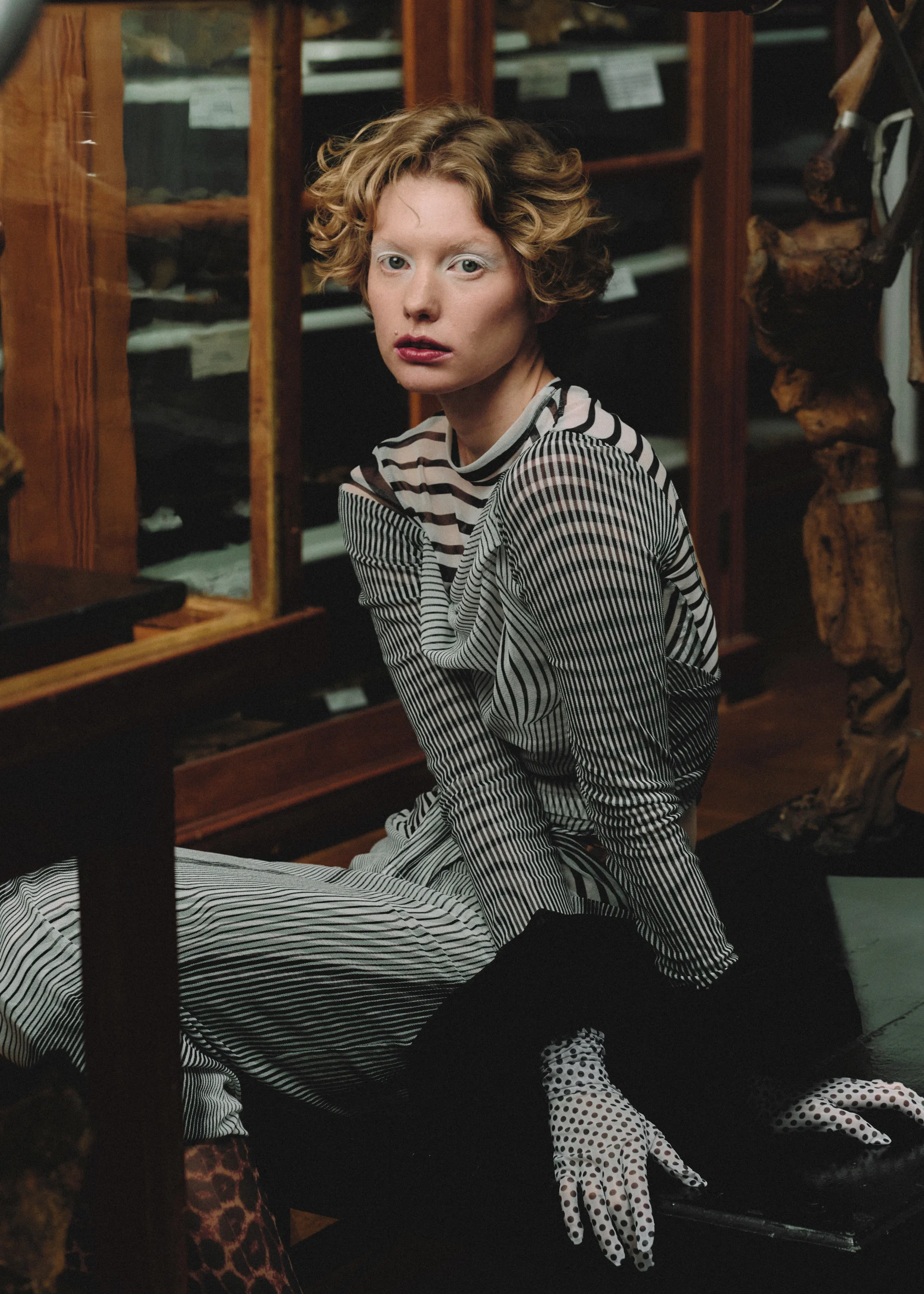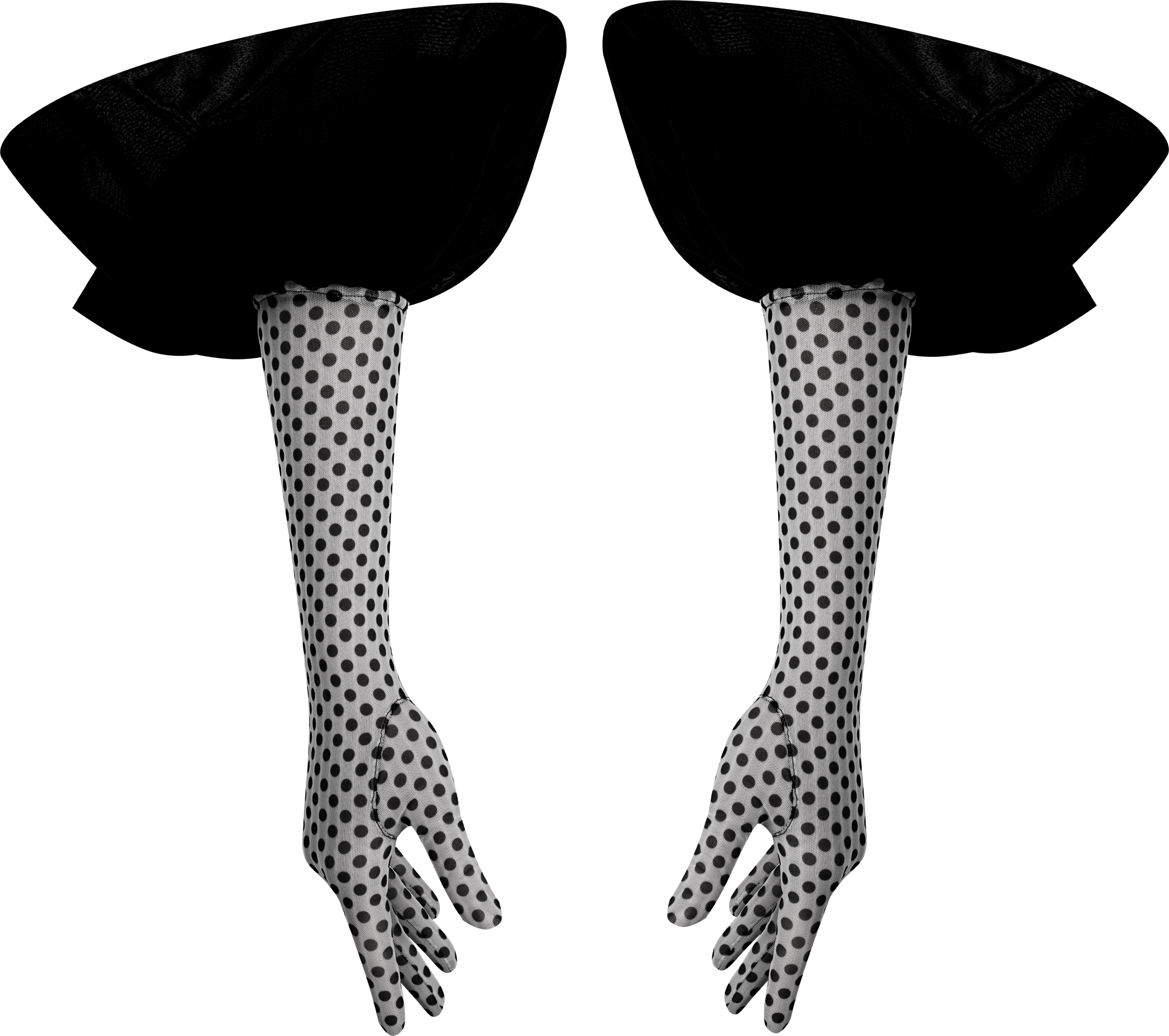 Rękawiczki średniej długości w czarno-białe groszki z elastycznej siatki.